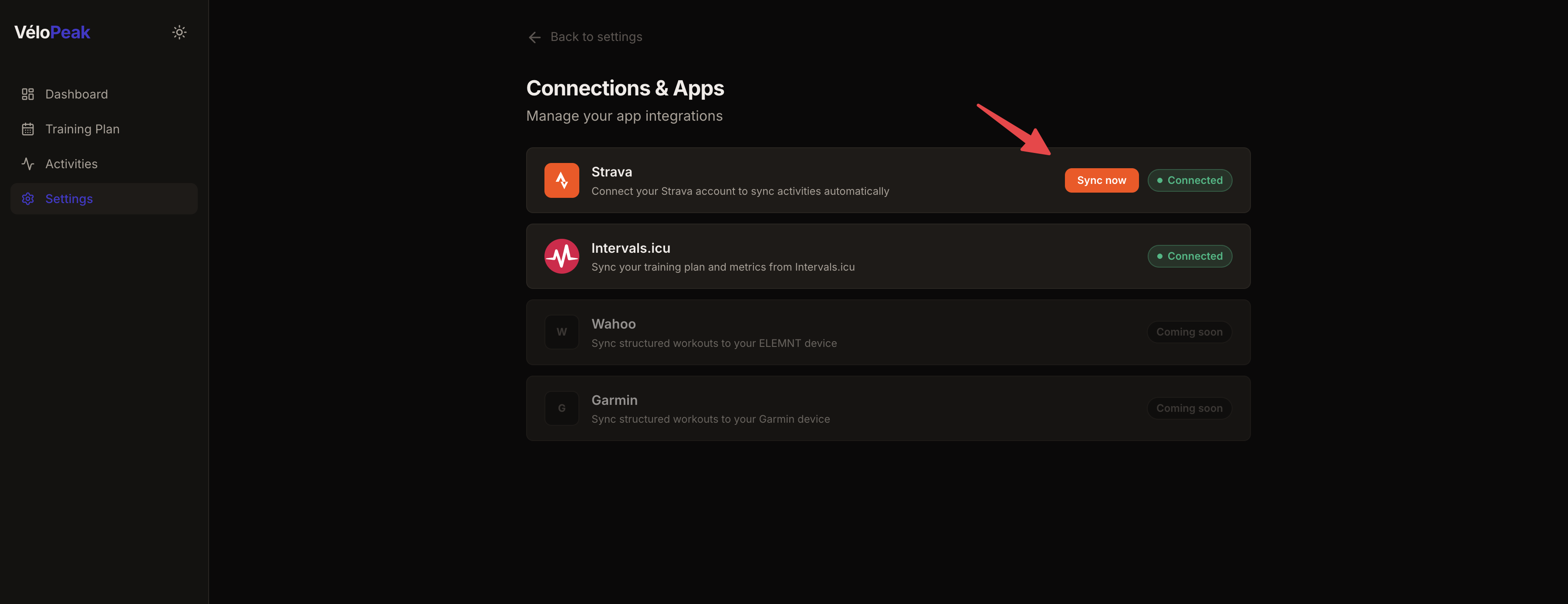 If you need to re-analyse a recent activity or trigger a manual sync, go to Settings → Connections & Apps and click Force sync next to Strava.