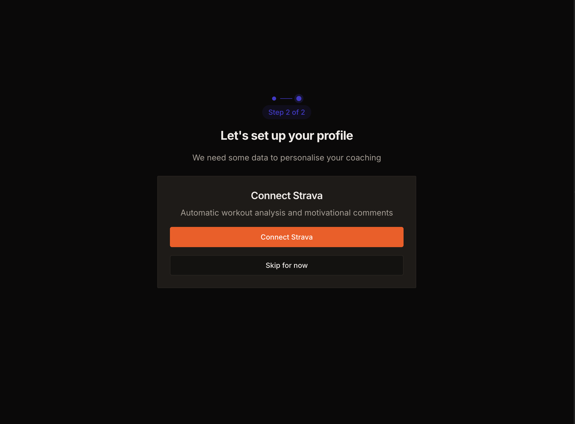 When you first sign up, VéloPeak will prompt you to connect your Strava account. Click Connect Strava and you will be redirected to Strava's authorisation page. After approving, you are sent back to VéloPeak automatically.