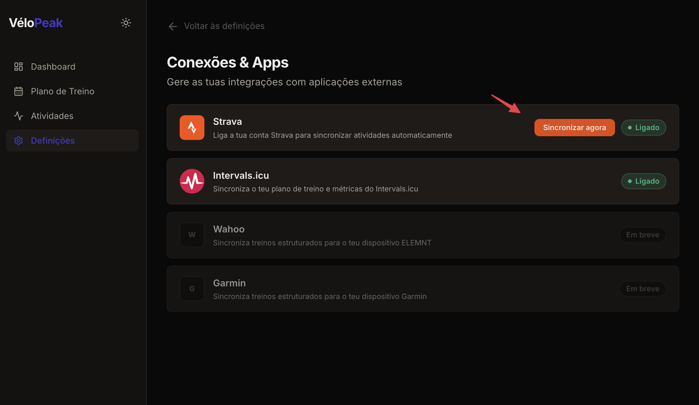 Se precisar reanalisar uma atividade recente ou acionar um sync manual, vá em Configurações → Conexões e Apps e clique em Forçar sync ao lado do Strava.